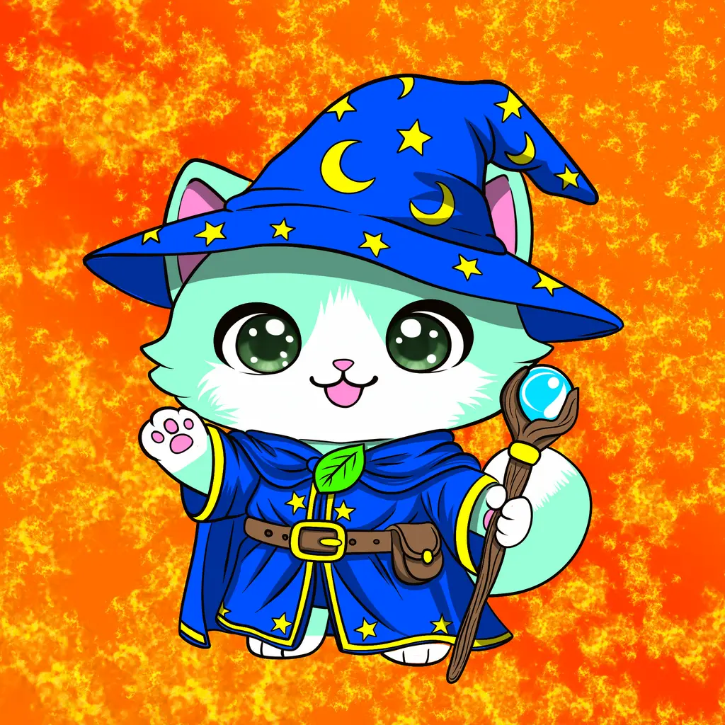 Blue Wizard Cat Bright and curious, Blue Wizard Cat carries a sky-blue robe with gold stars, a crescent-studded hat, and a wooden staff topped with a crystal orb. A leaf clasp hints at nature magic and calm wisdom. Hand drawn in crisp chibi style by Alfonso “Tang Bear” for Tang Gang on Chia, this 1-of-1 includes clear creator attribution and on-chain provenance. No rarity tiers. A core spellcaster of the ChiaCats genesis story and a clean anchor for early ¢NI collectors.