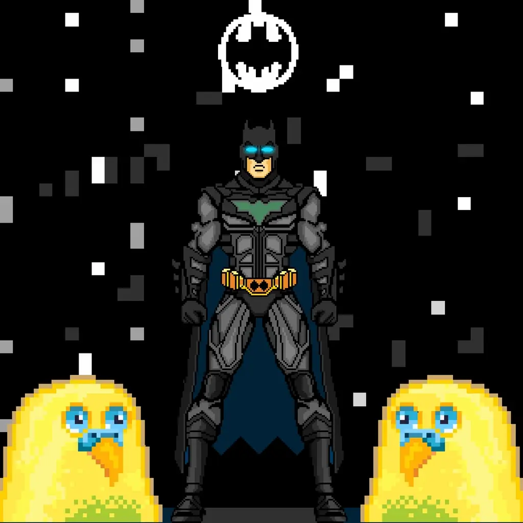 Witness the dynamic scene of Fucking Batman & Parakeet in this unique NFT artwork. Batman stands proudly in the center, his iconic symbol hovering above him. Flanking him on either side are the mischievous twin brothers, Parakeet. Caught in the midst of a playful disagreement, their eyes ignite with a fiery glow when angered. In a surprising twist, the Batman symbol transforms into a vibrant Emerald as Parakeet's eyes blaze with determination. Batman rises gracefully, lifted by a mystical green force, showcasing Parakeet's unexpected strength. Despite their cute and seemingly defenseless appearance, Parakeet proves they can hold their own. This artwork captures the essence of their friendship – a momentary clash followed by a display of individual power. Don't be fooled by their adorable facade, even the closest of friends can have their disagreements. Ultimately, Fucking Batman & Parakeet are a testament to enduring friendships, reminding us that everyone has the strength to stand tall, no matter how cute they may seem.
