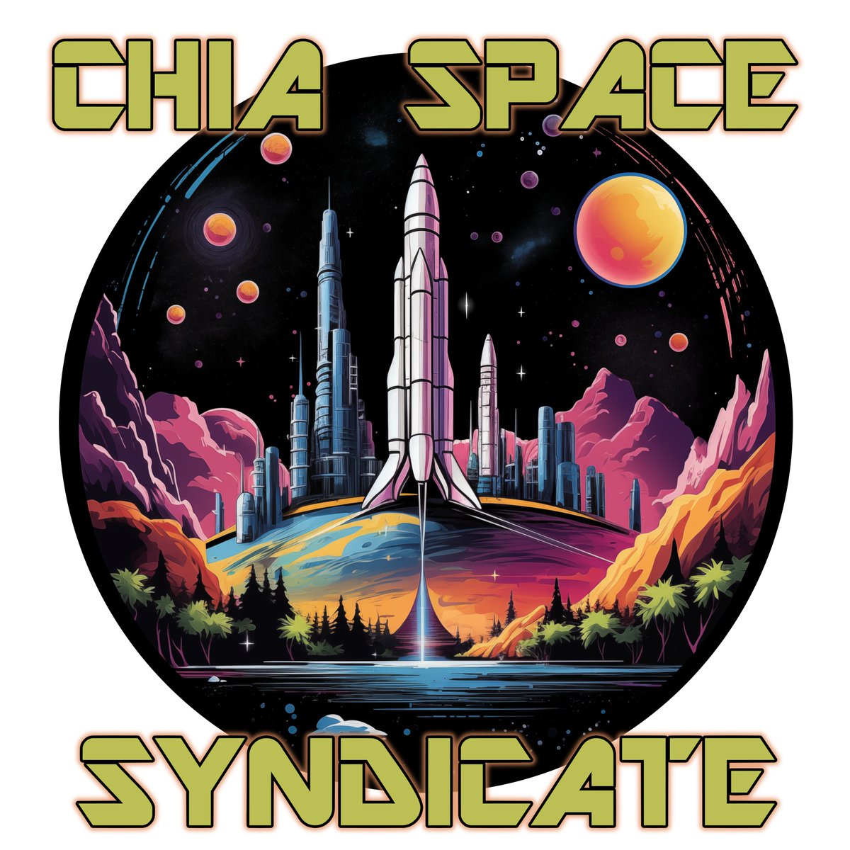 Cartoon gophers celebrate a rocket launch in a colorful, starry cosmos, one with a laptop, in a vintage poster labeled “Chia Space Syndicate.”