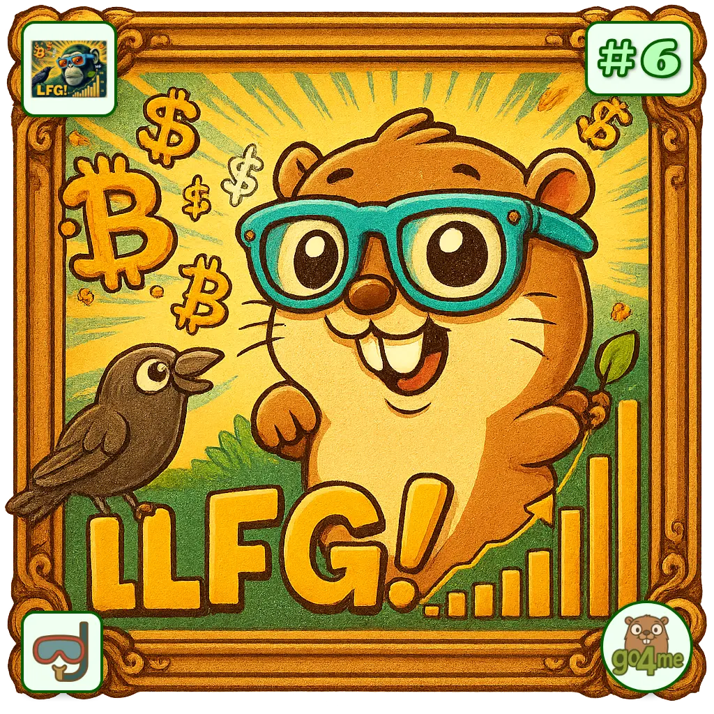 Cheerful cartoon gopher in blue glasses celebrates crypto gains, with Bitcoin symbols, a bird companion, and a rising bar chart in an ornate frame, captioned "LLFG!".