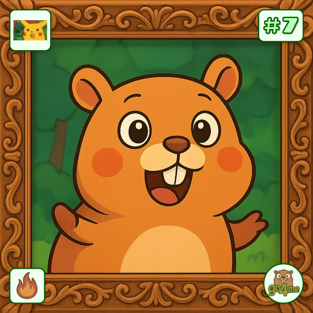 A cheerful cartoon gopher with rosy cheeks and big eyes, smiling inside an ornate wooden frame against a green forest backdrop.