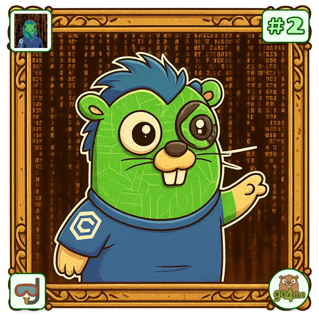 A green, blue-haired cartoon gopher in a blue shirt with a C badge, wearing a monocle and waving, framed by a vintage gold border against a backdrop of glowing code.