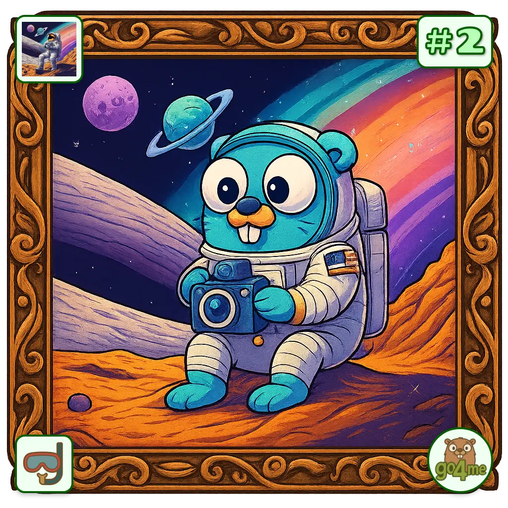 A cheerful blue gopher in a spacesuit snaps a photo on an orange alien landscape, with ringed planets and a rainbow nebula in the starry sky, all within an ornate wooden frame.