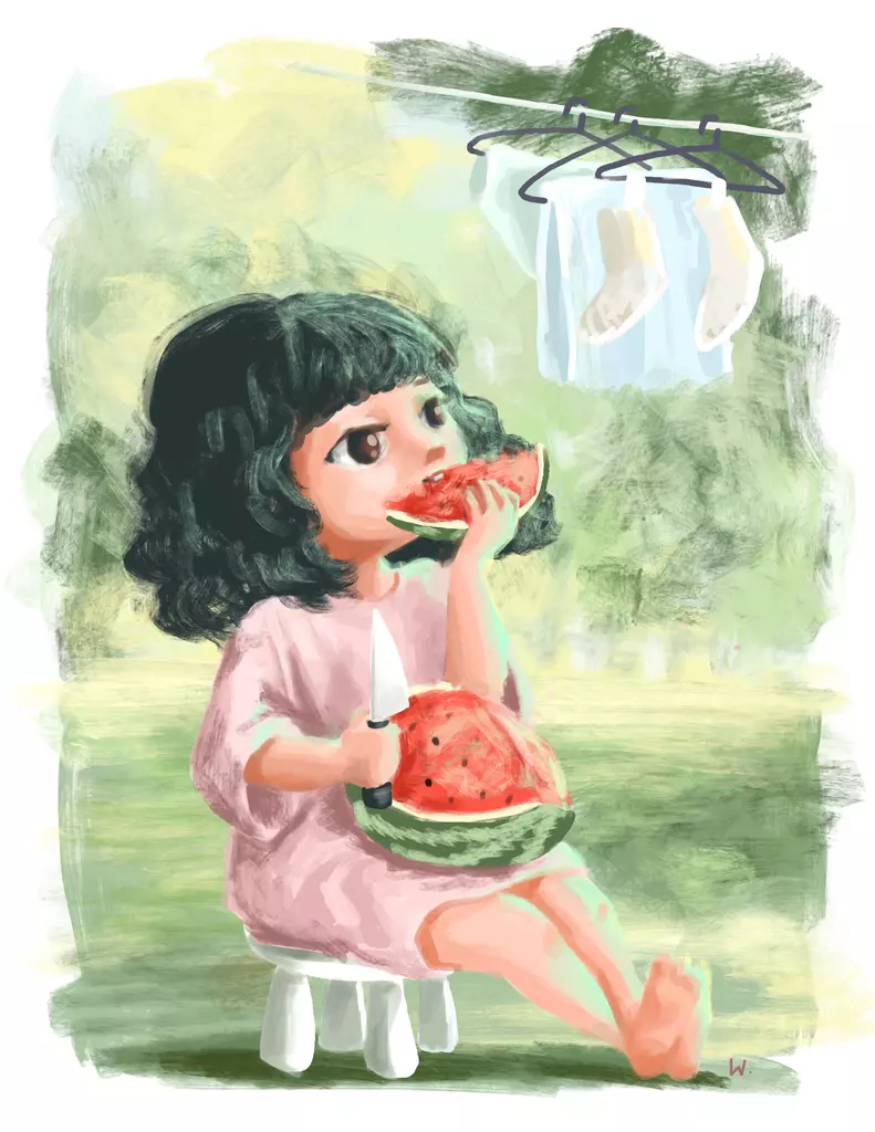 a girl only wants to eat her watermelon, in peace.