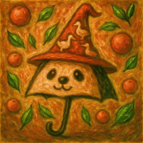 Tangie Pandarella is the citrus-sweet sorceress of the orchard realm. With a zesty personality and a Tang Gang core, his umbrella form hides powerful panda magic. His goose-hatted flair brings fruity joy wherever he floats.